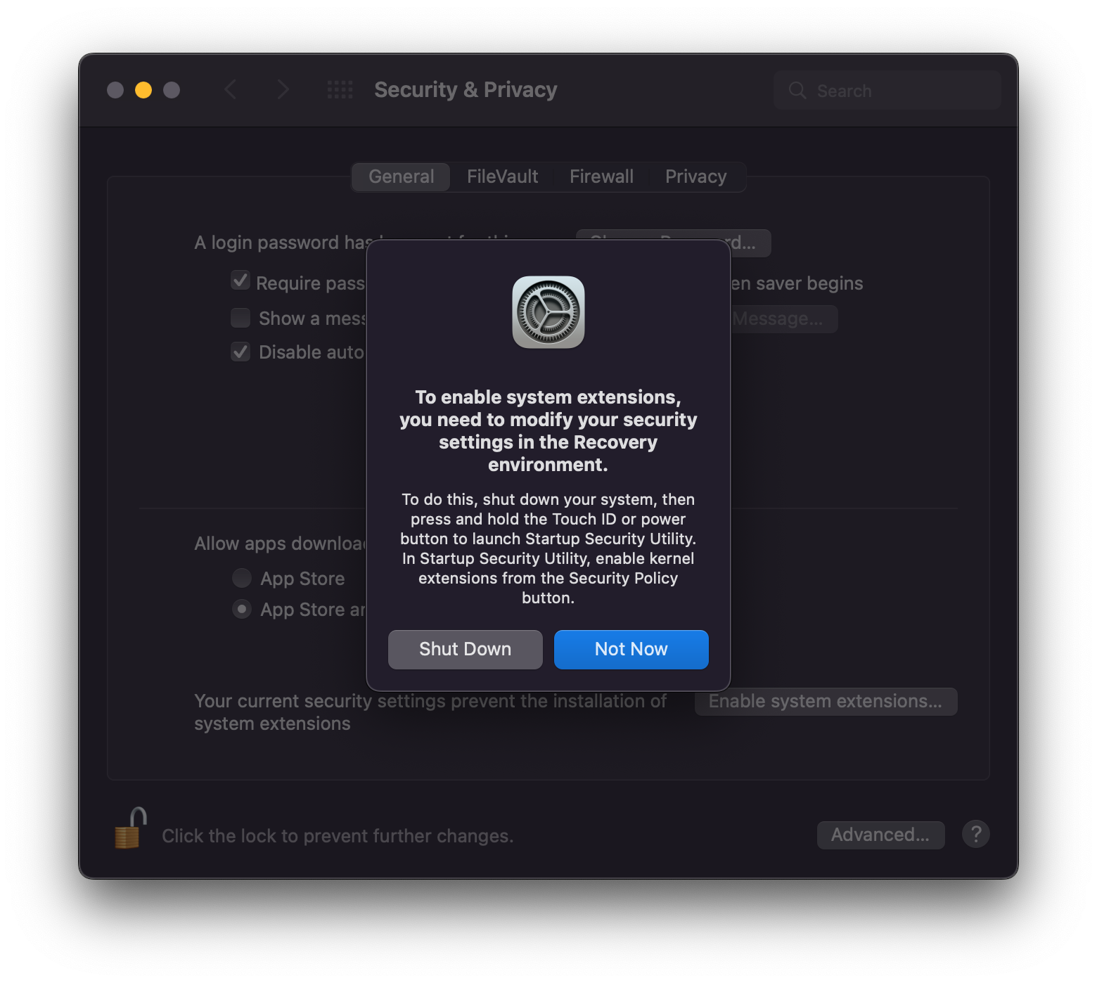 > By default, third-party kernel extensions are disabled on Apple Silicon Macs. Click on the lock in the lower left corner of the window and enter your login password. Then click on the "Enable system extensions…" button.